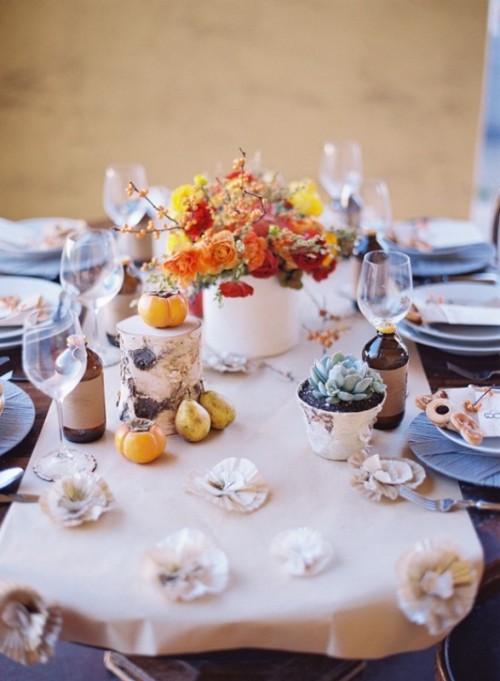 Nhữngquả bí ngô với nhiều kích cỡ, hình dáng khác nhau được sử dụng làm giá nến hay lọ hoa trang trí cũng là một gợi ý hoàn hảo cho bàn tiệc mùa thucủa bạn.